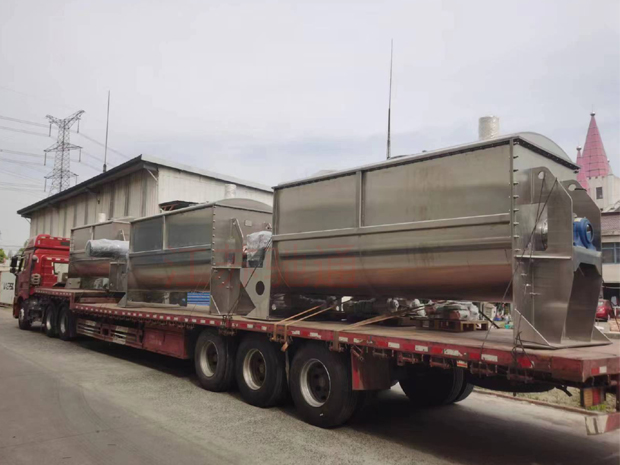 臥式螺帶混合機由混合倉、攪拌器、驅動裝置基本組成,U型管狀倉內安裝雙層異向螺帶盤繞的攪拌器軸,外螺旋帶在動力的驅動下,其盤繞形式配合旋轉方向把物料從U型倉兩端向中央地帶推動,而內螺旋帶把物料從中間向兩端推動,形成對流混合。 混合機臥式筒體底部中央開設出料口,外層螺旋帶的蝸旋結構配合主軸旋轉方向驅趕筒壁內側物料至中央出料口出料,確保筒體內物料出料無死角。